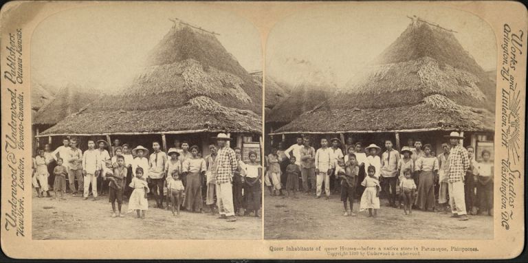 Underwood #U520. Large group of Filipinos stand before a tall nipa-roofed structure in Paranaque, Philippines.
