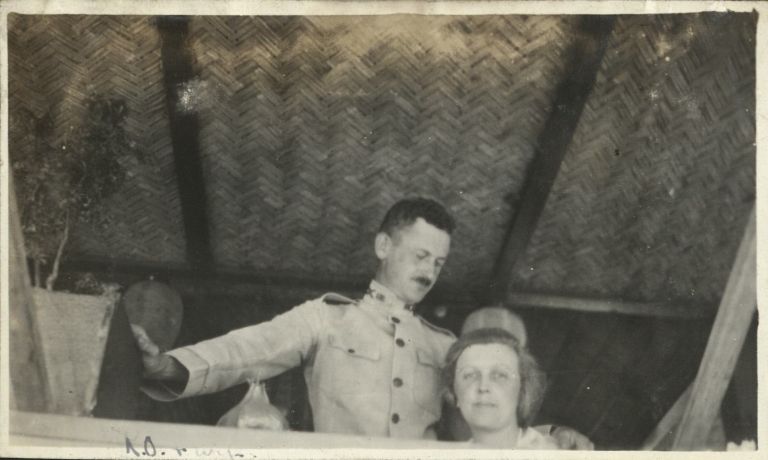 Subject: An American military officer and his wife look out from an elevated building. There are no other clues to their identity than the initials, but the building may be the same one seen in OFI-0