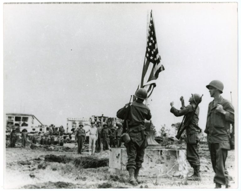 U.S. soldiers raise the flag at the damaged but recaptured U.S. High Commissioner's residence (now the U.S. Embassy in Manila) while Gen. Douglas MacArthur stands at attention in background.