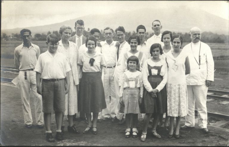 Ralph, Bob, Mother, myself [Harry Hawkins, Jr.], Luisita [Gimenez], Tommy, Alfred [Cerquetta], Augustine [Agustin Vallejo], Lolita, Carmen [Vallejo], Dan, Dad [Harry Hawkins, Sr.], Marucha [Gimenez], Simo, Mary [Vallejo] and Gov. Betts.
