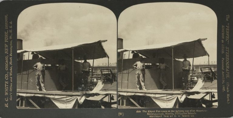 The Rapid Fire Guns in the fighting top of an American River-gunboat, Manila, Philippine Islands.
