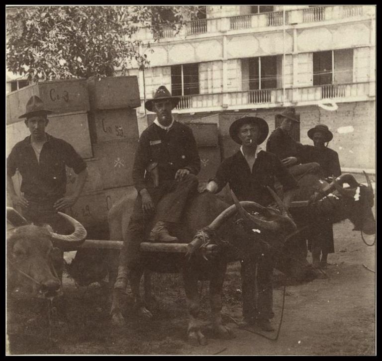 Subject: U.S. soldiers rely on the traditional Philippine carabao and cart to transport their crated supplies, although apparently they complain about the speed at which these animals move.