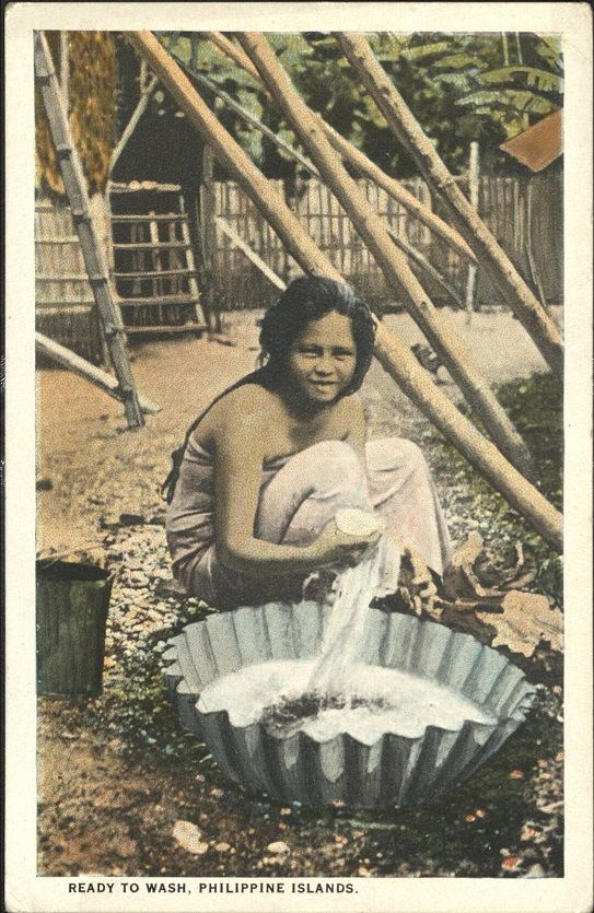 Subject: Young woman crouching, smiling, and washing clothes in corrugated metal wash bin.