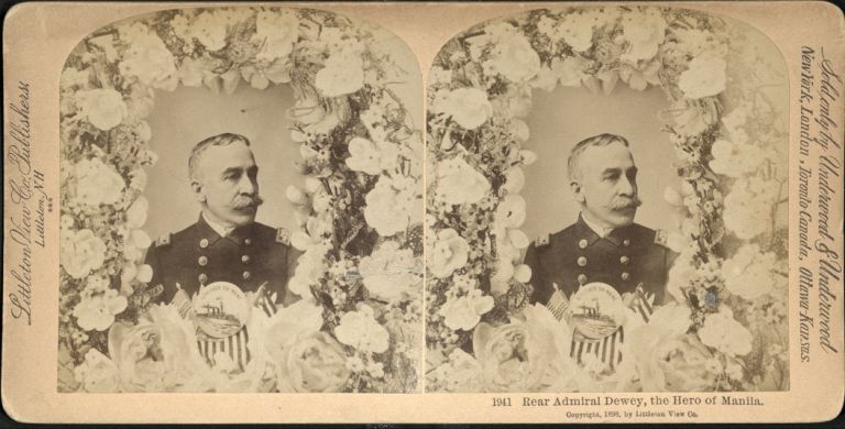 Underwood #U1941. Formal portrait of Admiral Dewey, U.S. naval commander U.S. naval commander during the Battle of Manila Bay, with floral border.