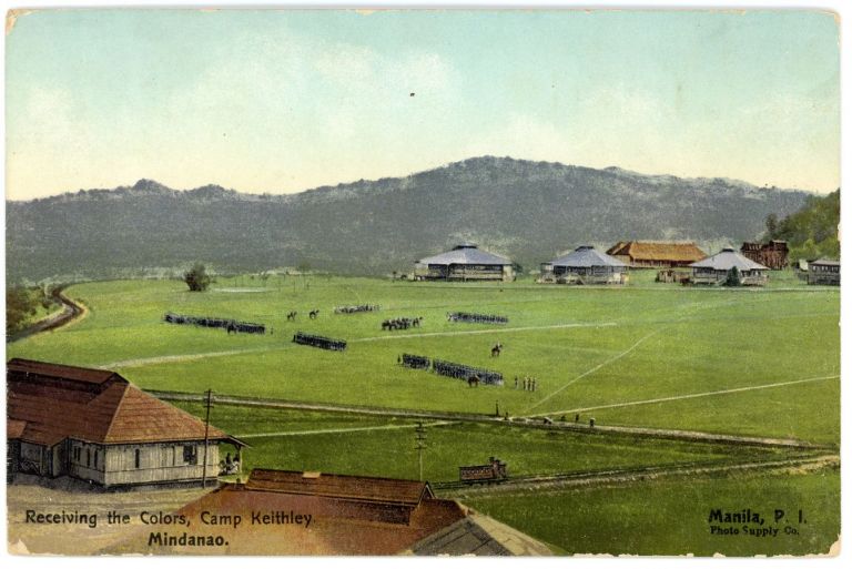 Military ceremony on parade grounds. Camp Keithley was a U.S. Army garrison near Marawi City named for Guy Furnando (Fernando) Keithley, a U.S. Army private who served in 28th Infantry Regiment during the Philippine Insurrection. He was killed in action againt Moro tribesmen on November 14, 1903 and buried in the Army post of Marahui on the Island of Mindanao.