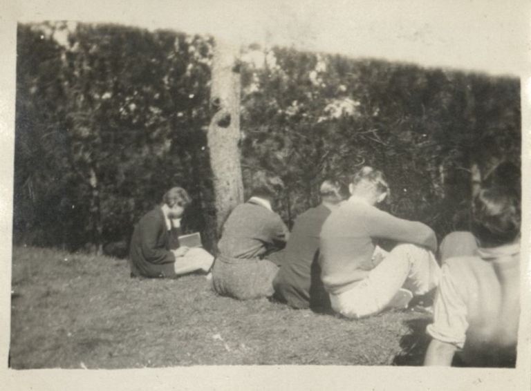 Subject: This bank over a pine-filled gully on the Brent School grounds must have been a popular hangout for students on breaks, as it features frequently in young Harry Hawkins' photographs of classm