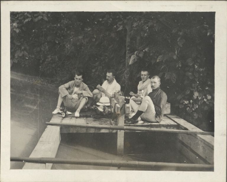 Subject: Four expatriate men, possibly rowers with their oars (see OFI-002396) relax on a floating dock on the San Juan River, in San Francisco del Monte which is now part of Quezon City. See also OFI