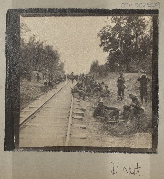 Subject: U.S. soldiers, presumably of the 1st South Dakota Volunteers, take a rest break alongside a Philippine railroad track. Lieut. Munson M. Z. Guthrie was an officer in Company A, 1st South Dakot