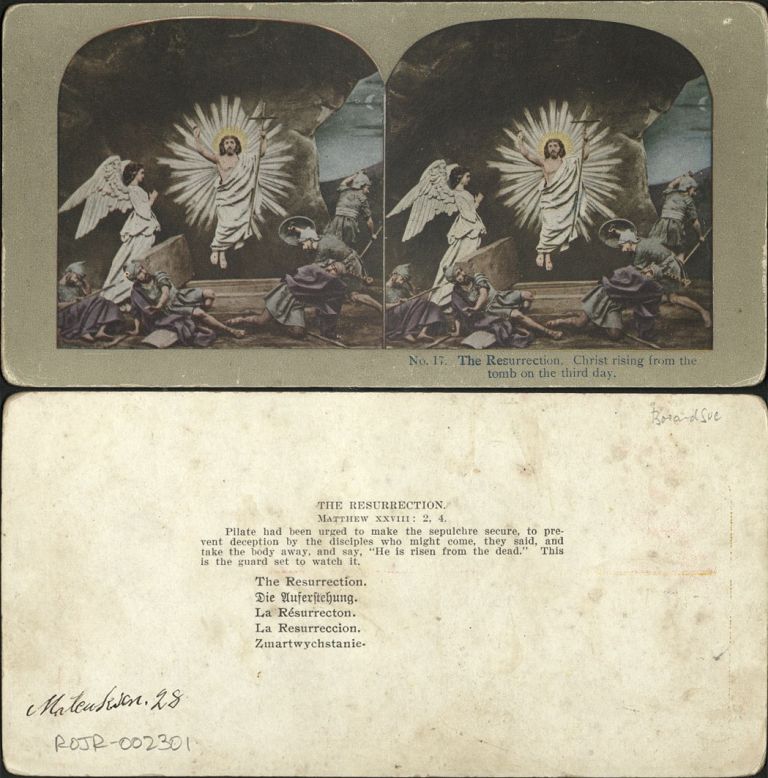 Religious-themed #REL-0xx. Illustration of Jesus rising from the tomb before the fightened Roman guards.