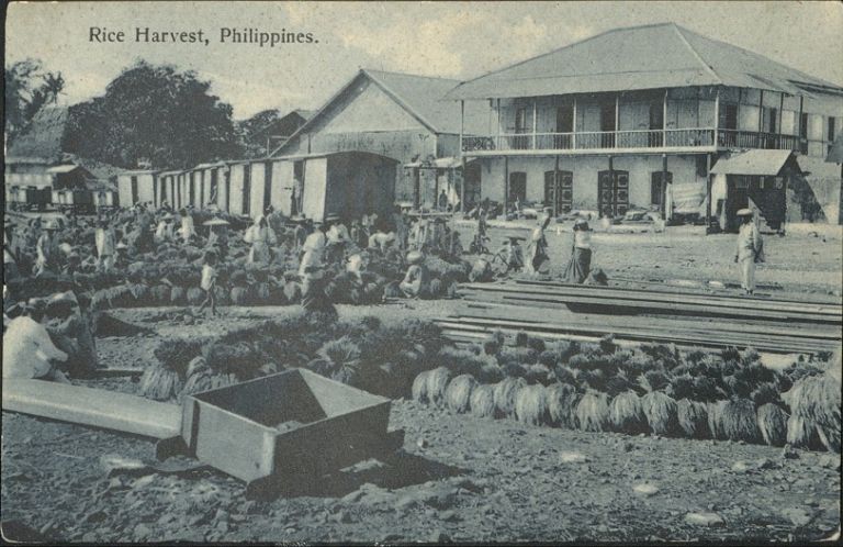 Subject: Many people standing among rice stalks, gathered and tied in bundles, drying in sun outside large building.