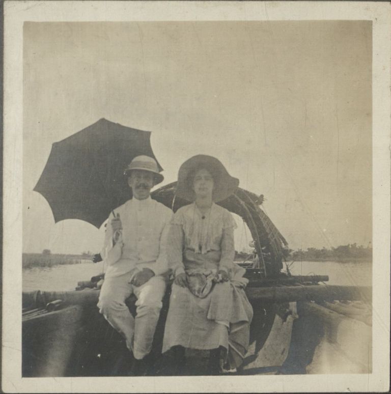 Subject: Two expatriates (the woman is possibly Mercedes Macleod) ride a banca on a Philippine river. Several Philippine rivers have been called the "Rio Grande" - the Mindanao River, Cagayan River, a