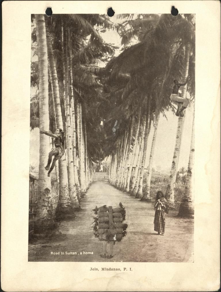 Subject: This appears to be the "Avenue of Palms" or "Coconut Avenue" in Jolo (see ROJR-001136 and ROJR-000789). The men climbing trees are regrettable paste-ons to the original image befo