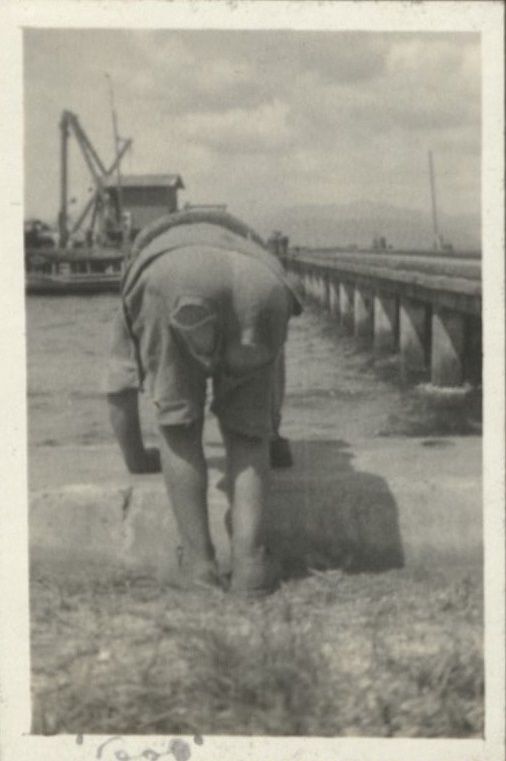 Subject: A man bends over, exposing the holes in his worn-out pants seat. Probably at Subic Bay Naval Station.