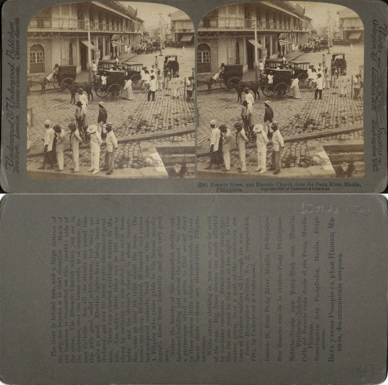 Underwood #U30a. Street scene of Rosario St., pedestrians, calesas, carts; commercial buildings left; Binondo Church in distance.