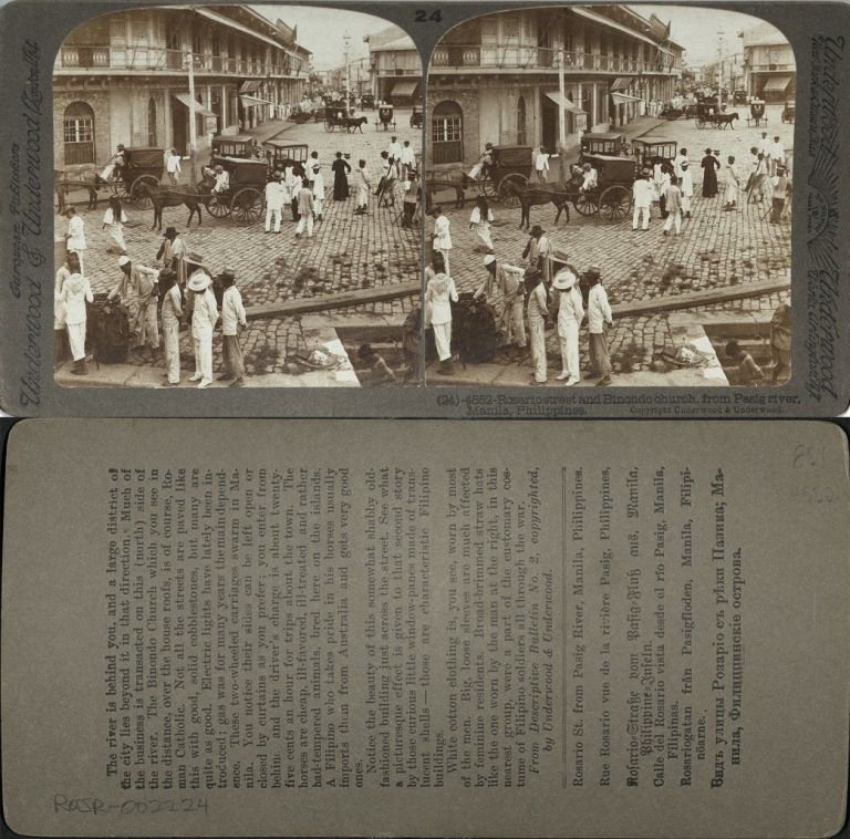 Underwoood #U4552, Street scene of Rosario St., pedestrians, calesas, carts; commercial buildings left; Binondo Church in distance.