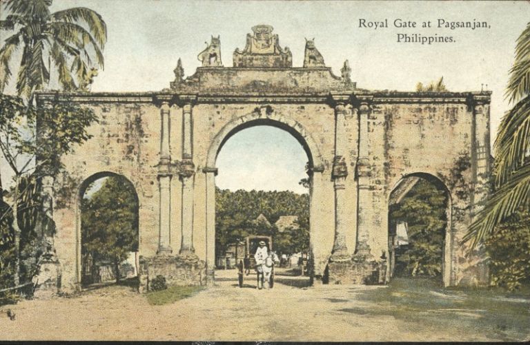 Subject: Man with horse and cart pass through grand, arched city gates in Pagsanjan. Pagsanjan Arch also known as Puerto Real or Arco Real was built from 1878-1880. Historian Gregorio F. Zaide, a nati