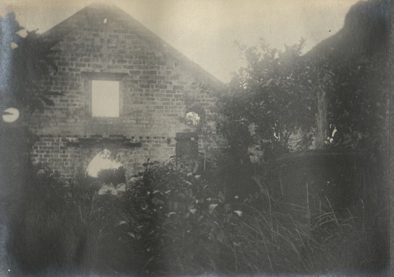 Subject: View from inside a ruined, roofless church in Bailen, Cavite Province. Tents of a U.S. Army encampment are seen through the Gothic arched door. The municipality of Bailen, near Mar