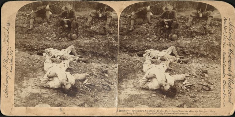 Underwood #U1260b. 2 dead Filipinos in foreground; 3 U.S. soldiers behind them, Malabon, Philippines.