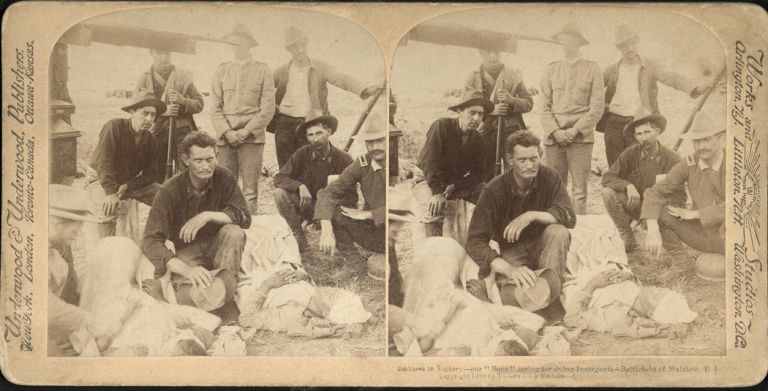 Underwood #U1280a. 7 U.S. soldiers stand over 2 wounded Filipinos, Battle of Malabon, Philippines.