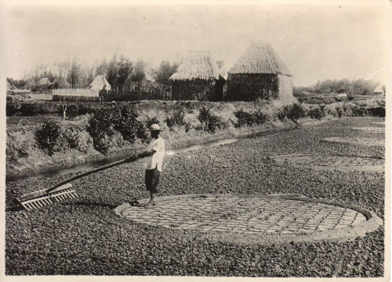 Salt production by the Philippine method. Preparing the soil to be sprinkled with brackish water. Bacoor.