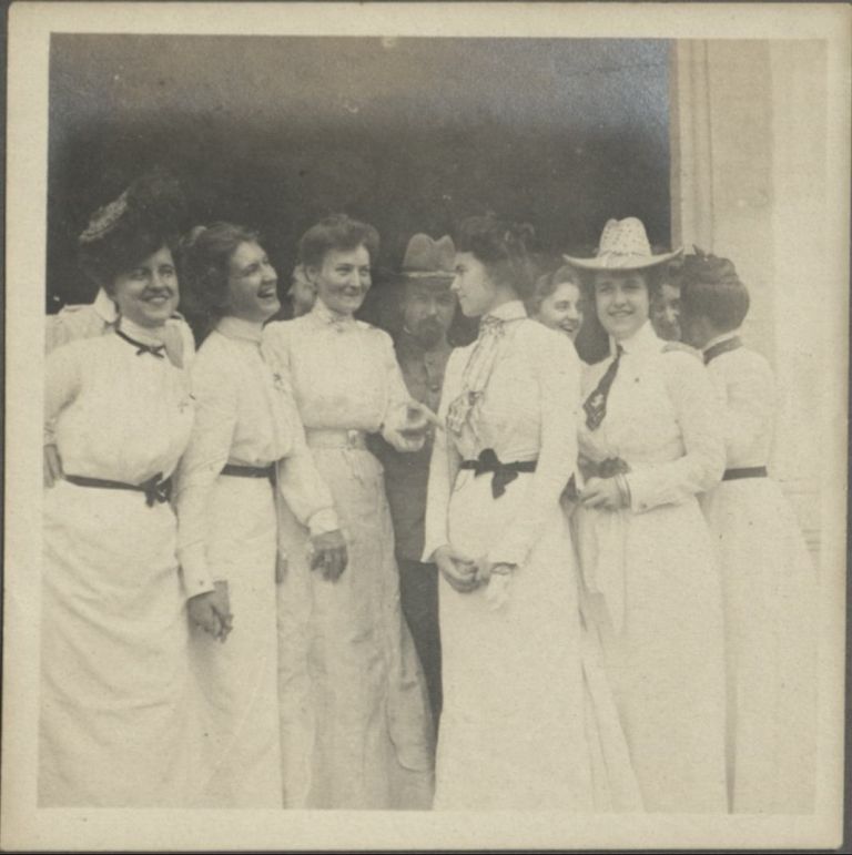 Subject: Young American women stand in a doorway, talking and laughing. General Frederick Funston photobombs in the background. Funston served in the Philippines from 1898-902 during the Philippine-Am