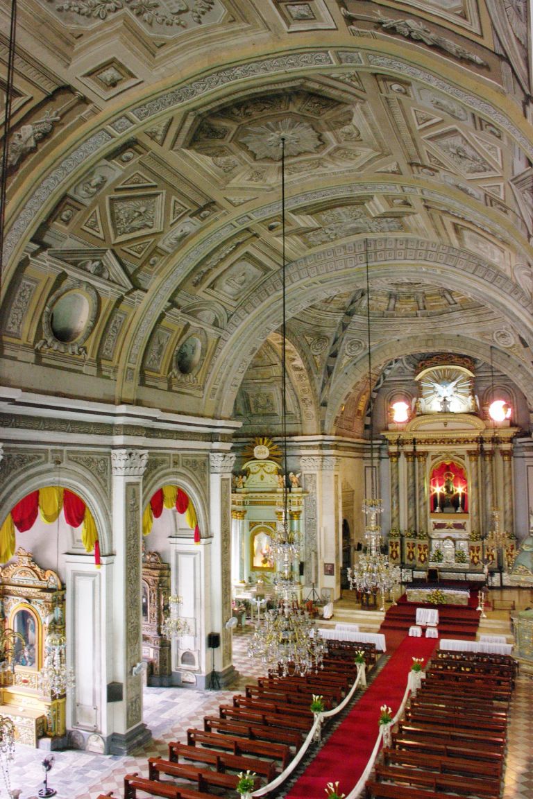 Subject: The pews, altar, retable and ceiling of San Agustin Church, located inside the historic walled city of Intramuros in Manila. The trompe l'oeil ceilings give the illusion of depth and were pai