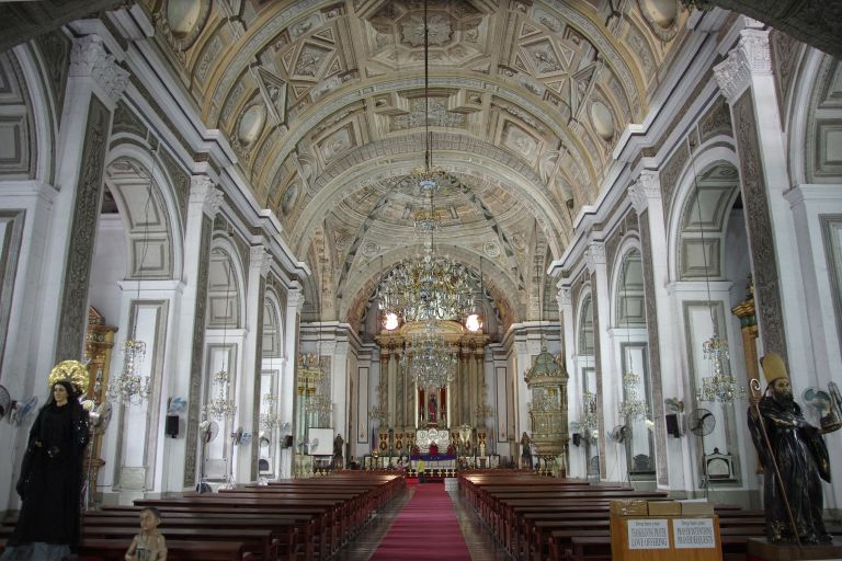Subject: The pews, altar, retable and ceiling of San Agustin Church, located inside the historic walled city of Intramuros in Manila. The trompe l'oeil ceilings give the illusion of depth and were pai