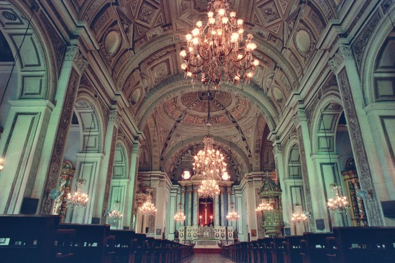 Subject: The magnificent ceiling and chandeliers of San Agustin Church, located inside the historic walled city of Intramuros in Manila. The trompe l'oeil ceilings give the illusion of depth and were