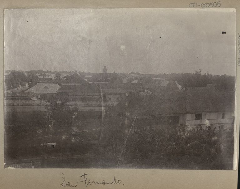 Subject: A view of the city of San Fernando, Pampanga province. Over the rooftops can be seen the bell tower of the church on the center horizon. Lieut. Munson M. Z. Guthrie was an officer in Company