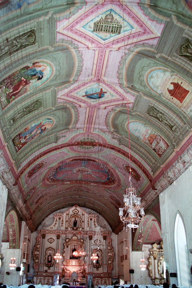 Subject: Interior view of mural painted ceiling of San Guillermo de Aquitania Parish Church, Dalaguete, Cebu, commonly known as Dalaguete Church. The current church was constructed between 1802-1825.