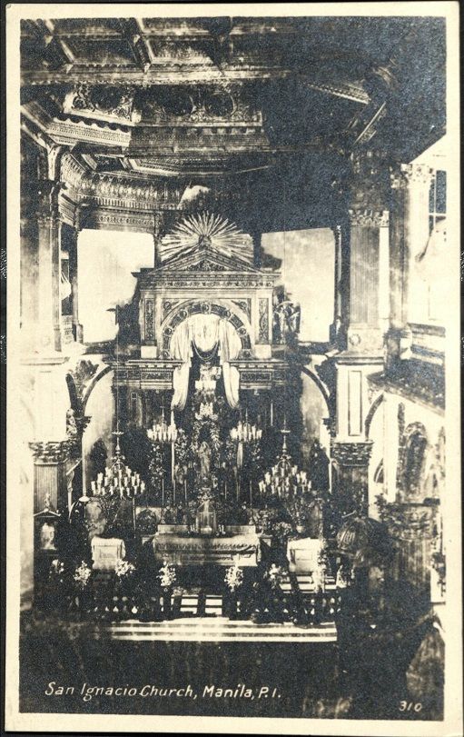Subject: Intricately carved altar with candles at San Ignacio Church in Intramuros (destroyed in the 1945 liberation of Manila).