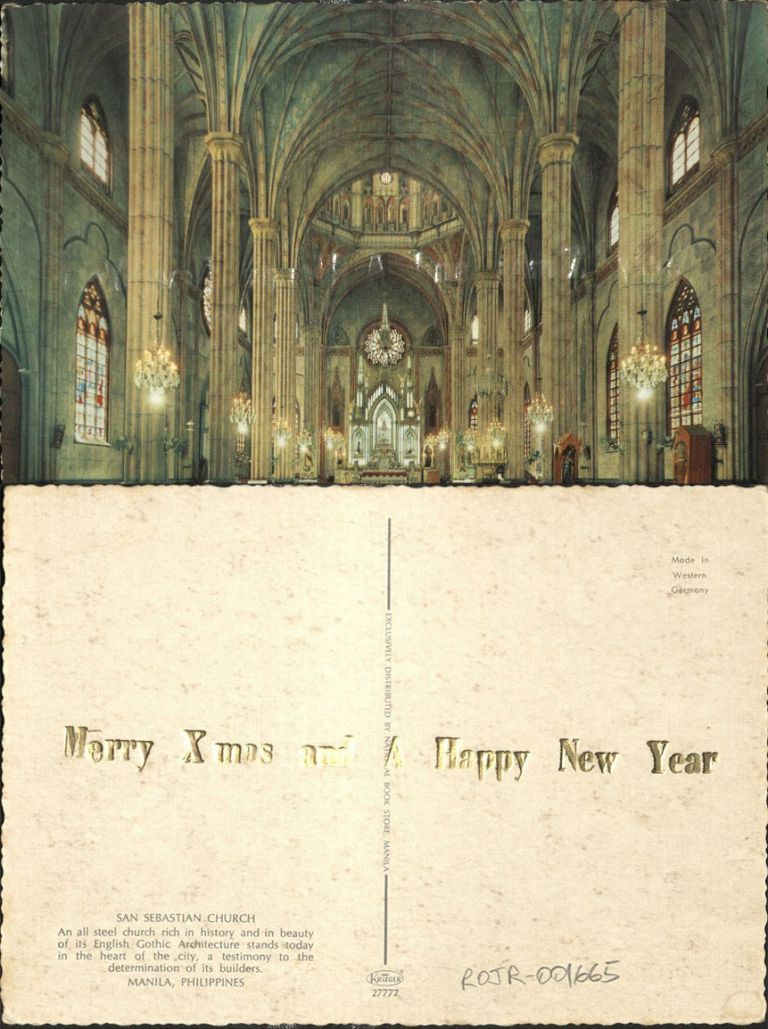 Subject: Interior view of San Sebastian Church in Manila facing altar, showing nave, pews, columns, ceiling, and stained glass.