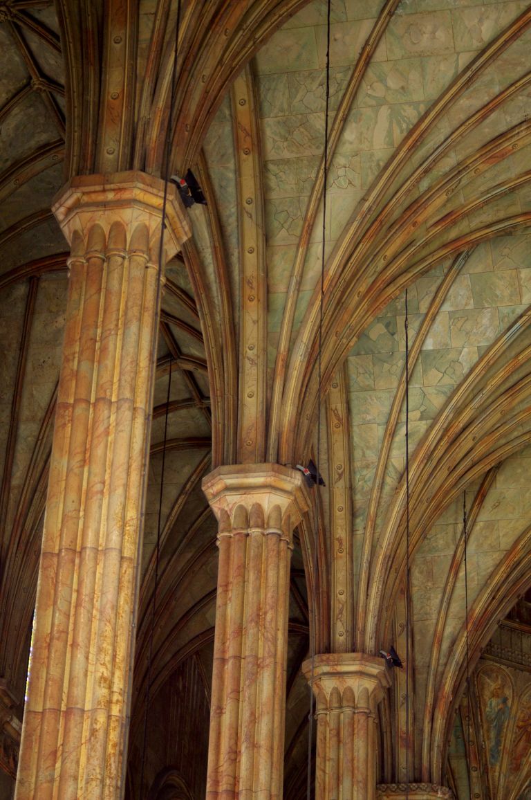 Subject: Interior view showing column tops blossoming into Gothic-revival ceiling vaults in the Bas�lica Menor de San Sebasti�n, better known as San Sebastian Church in Manila. The faux finished i