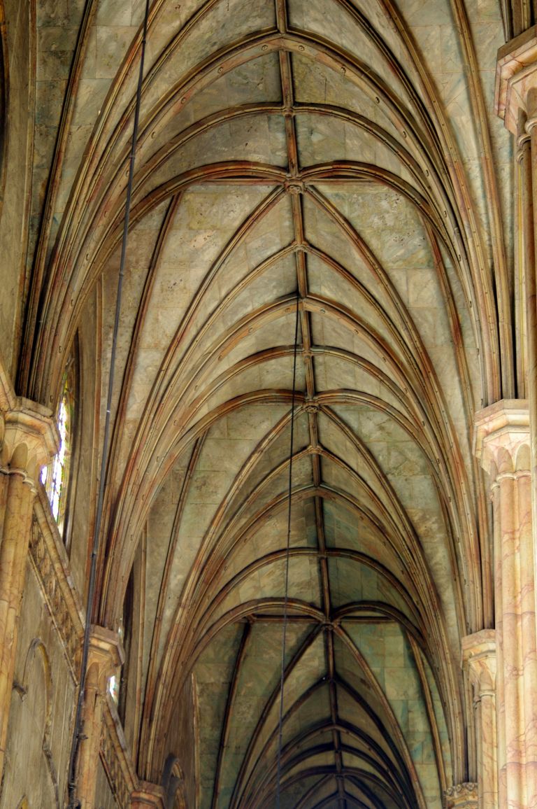Subject: Interior view showing column tops blossoming into Gothic-revival ceiling vaults in the Bas�lica Menor de San Sebasti�n, better known as San Sebastian Church in Manila. The faux finished i