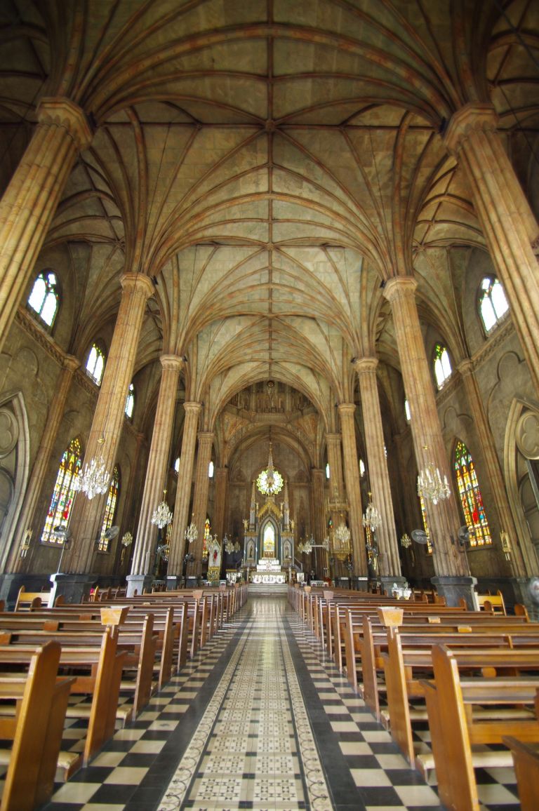 Subject: Interior view showing the Gothic-revival ceiling, columns, altar, and windows of the Bas�lica Menor de San Sebasti�n, better known as San Sebastian Church in Manila. The faux finished int