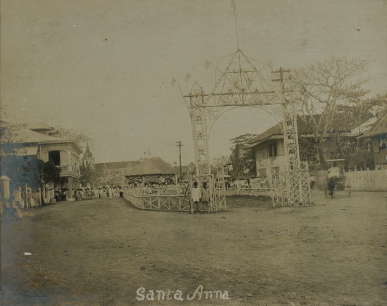 Subject: A street view of Santa Ana district in Manila, similar to OFI-001892, but here the street is crowded with people and decorations (including American flags which don't have the corr