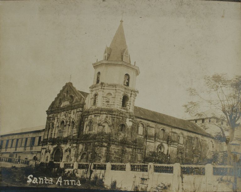 Subject: Nicely detailed view of Santa Ana Church of Manila ((Parish of Our Lady of the Abandoned). Construction began on this church in 1720. The pointed metal roof of the bell tower repla