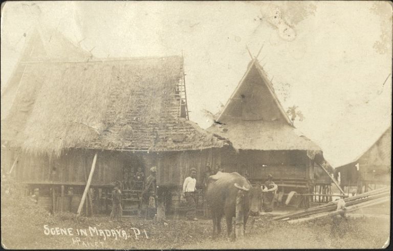 Subject: Family and carabao in front of nipa huts. Madaya is a barangay of the municipality Binidayan in the province Lanao del Sur in Mindanao.