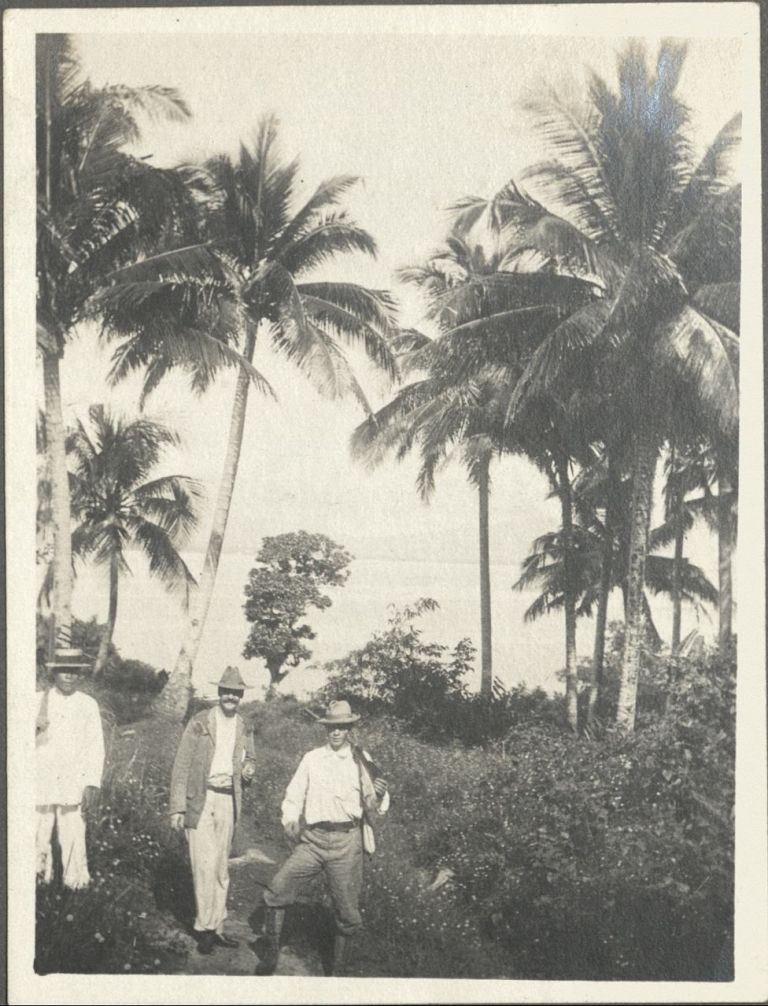 Subject: Two expatriate men and a Filipino with hunting rifles on a steep coast near Tabaco City. Beyond the cocnut palms lies the Lagonoy Gulf and probably San Miguel or Bacacay Island in the haze.