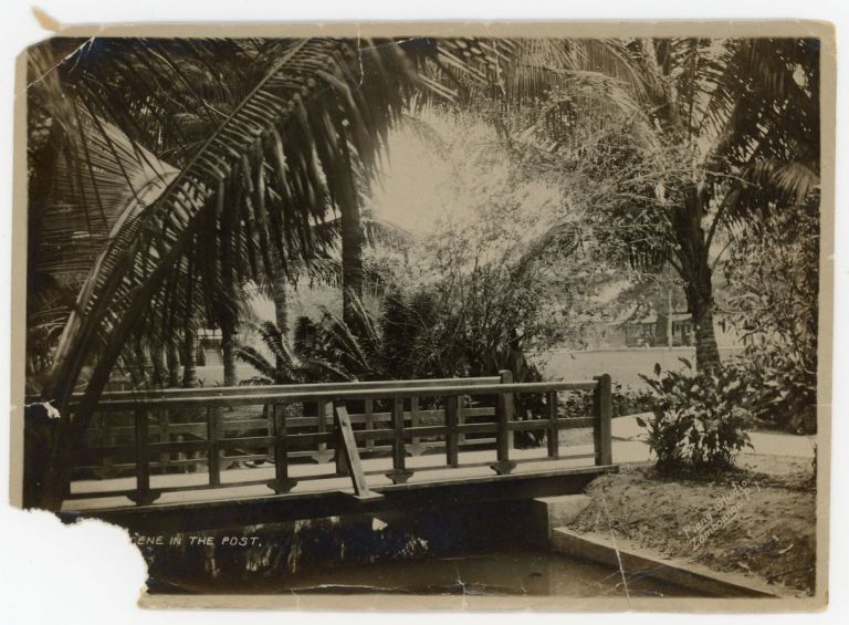 Footbridge over a shady stream at a U.S. Army post in the Philippines, possibly in Zamboanga City (see ROJR-001555 for a similar view). Zamboanga was the site of Pettit Barracks, home of the US Army officers and their families.
