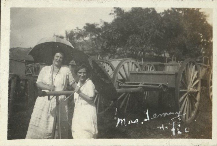 Subject: Two American women, likely military wives, with parasols in front of carts or weapons while on a picnic on Corregidor.