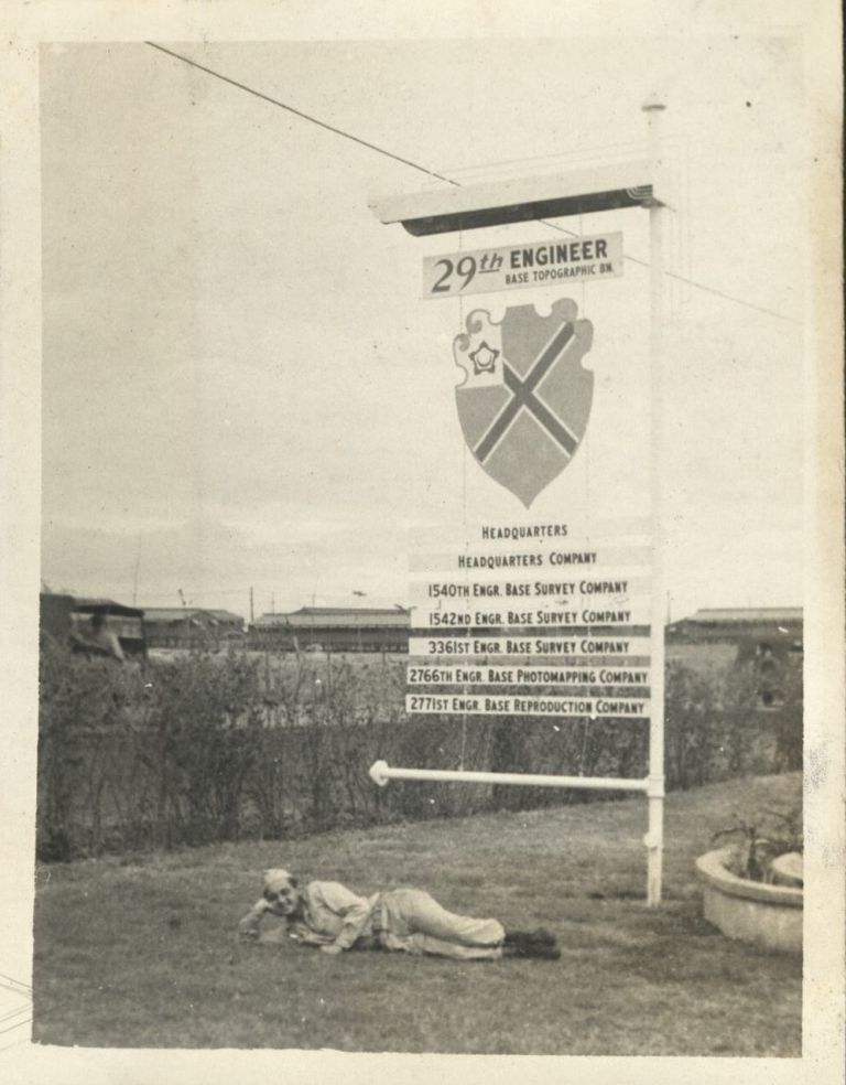 Seen around the 29th [Engineer Base Topographic Battalion. Soldier lies by Battallion directional signboard].