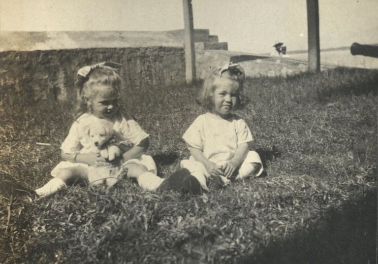 Subject: Probably this is Betty (holding puppy) and Isabelle Baird, playing on the grass.