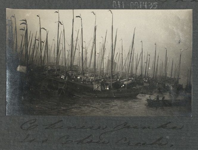 Subject: View from a passenger ship towards a forest of masts of Chinese junks in Shanghai. Suzhou Creek (Anglicized as Soochow Creek, also known as the Wusong River) flows through the cent