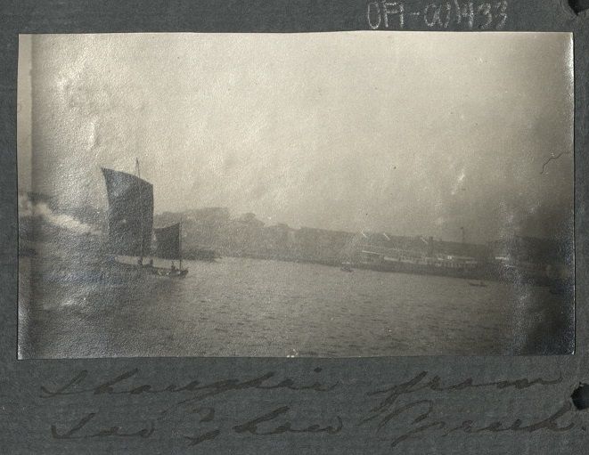 Subject: View from a passenger ship towards the buildinbgs of Shanghai. Suzhou Creek (Anglicized as Soochow Creek, also known as the Wusong River) flows through the center of Shanghai, maki