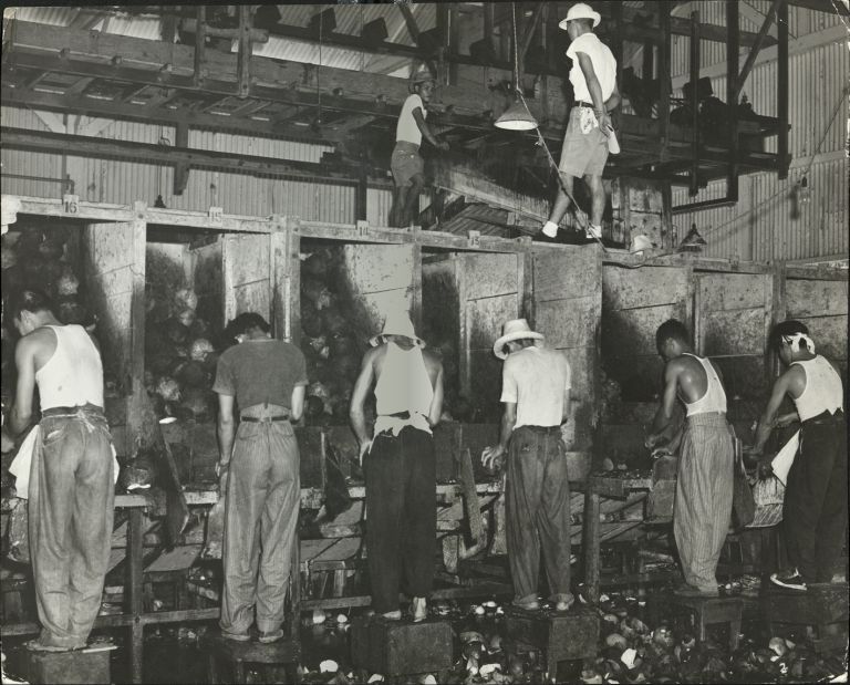 Subject: Male workers hull coconuts in a factory setting. Furukawa Plantation in Daliao Town in the Toril District of Davao City dates back to 1903 when Japanese migrant workers and investors started