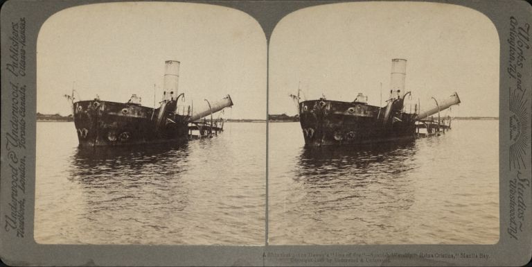 Underwood #U670. Spanish warship Reina Maria Christina lies sunk and destroyed in shallow water of Manila Bay.