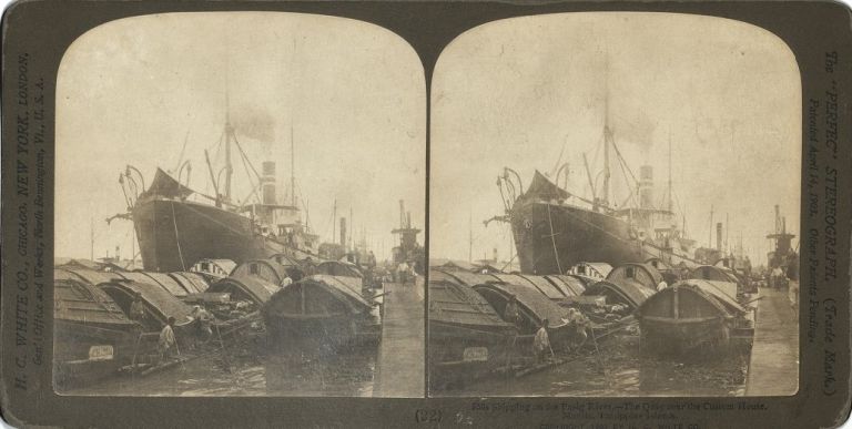 H. C. White #W3534. Cascos (local freight boats) in foreground, large steamship in background, at anchor along pier in Pasig River, Manila.