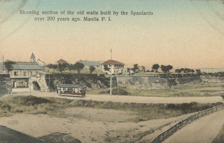 Subject: Wide view of Intramuros wall with gate for road, streetcar in Manila.