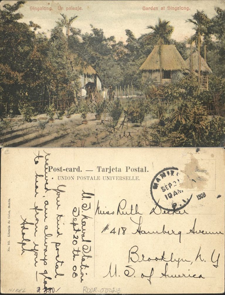 Subject: Garden view with nipa huts in Singalong, now San Andres and Malate in Manila.